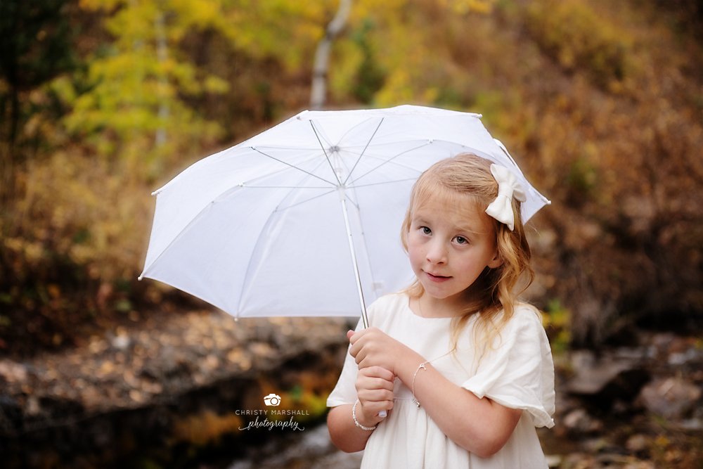 The day of this LDS Baptism photo session was dreary. As I drove to the location in the canyon I could see all the low hanging rain clouds above the entrance to the canyon. I prayed and prayed that I would have enough time to take this cute little girls pictures before the rain started. When I got the location it was not raining but being early October the canyon here in Utah was chilly. I met Miss P and her mom, and I have to say, Miss P was a little shy at first but then we talked talking like good friends. Miss P was a bright ray of sunshine for me on that gloomy day. She did so well with her session and I love that they brought a white umbrella to use as well, just added to her charm. Thank you Miss P for a wonderful time.